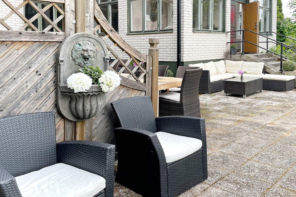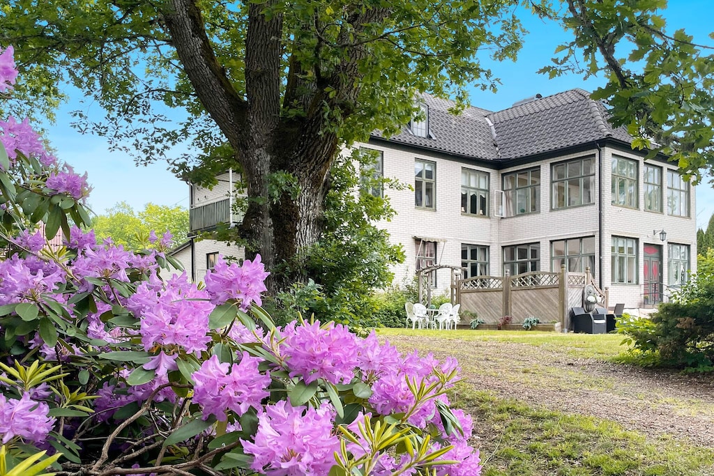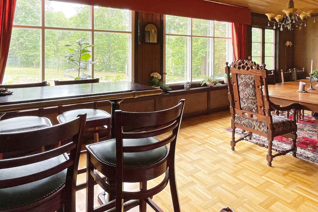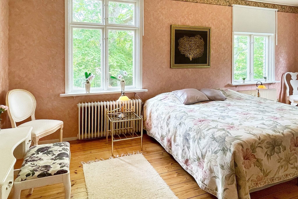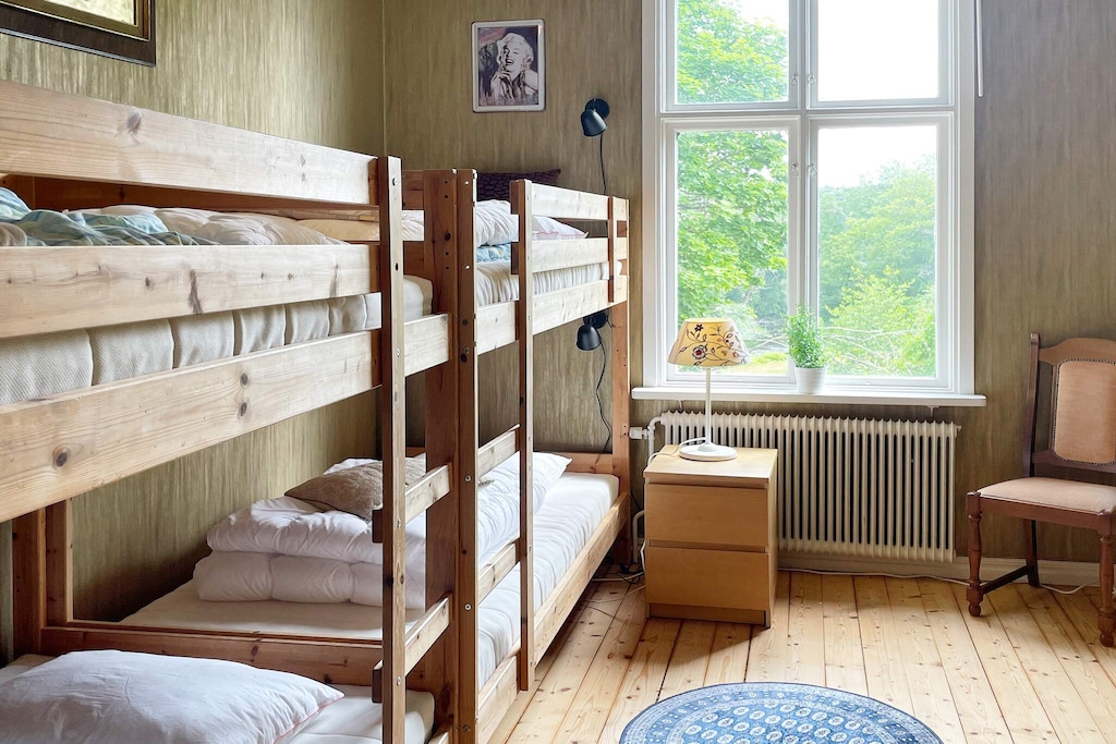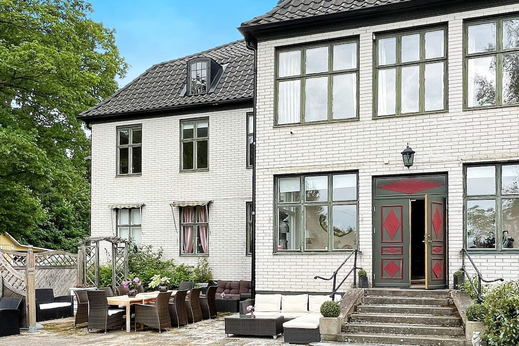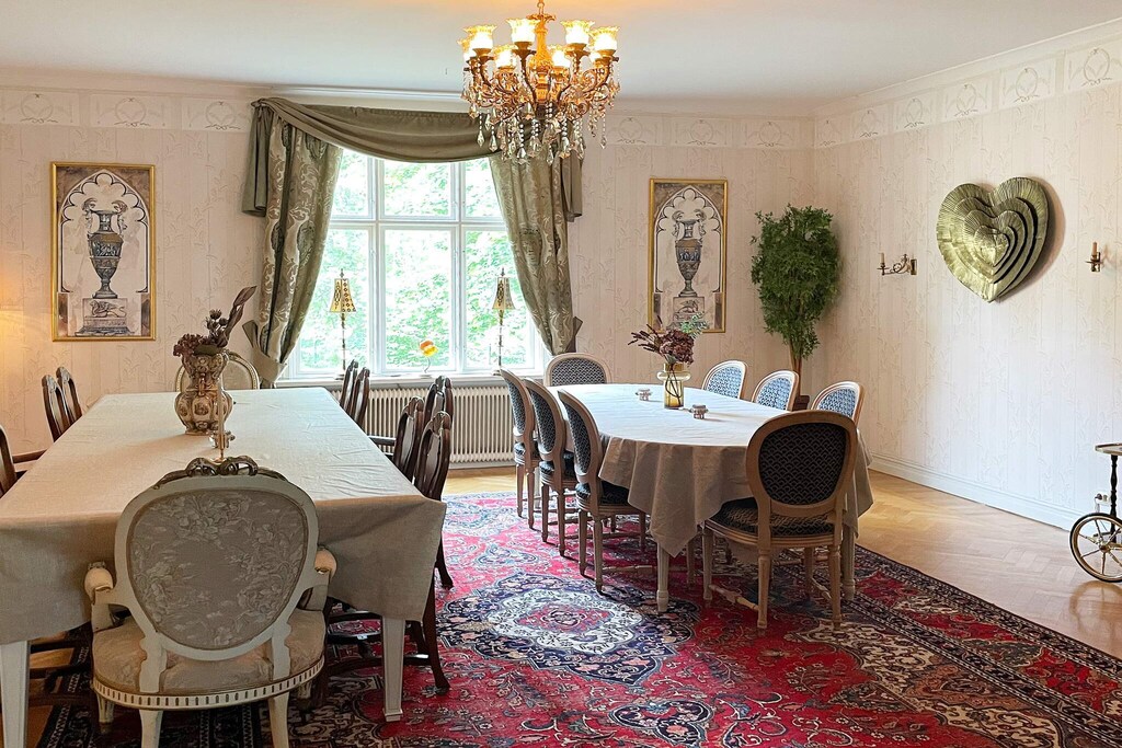 Willkommen in Blekinge, wo Sie hier Freunde und Familie in dieser fantastischen Unterkunft in wunderschöner Umgebung, direkt neben Mörrumsån, versammeln können. Das aus dem 19. Jahrhundert stammende Feriendomizil wurde in der Nachkriegszeit sowohl als Privathaus als auch für Aktivitäten des Roten Kreuzes genutzt. Heute dient es als einladende Unterkunft für bis zu 21 Personen. Bereits am Haupteingang auf der Veranda werden Sie von einem einladenden, schönen und modernen Interieur begrüßt. Das sorgfältig renovierte Gebäude, mit gut erhaltenen Fenstern und hohen Decken, präsentiert sich modern und zugleich mit etwas nostalgischem Charme. Hier findet man Ruhe und das Familienleben verteilt sich vom Spielzimmer über den Gesellschaftsraum bis hin zum Esszimmer. Eine geräumige Küche, mit allen Möglichkeiten zur Selbstversorgung und mit großem Kühlschrankraum zur Aufbewahrung von Speisen und Getränken, steht ebenfalls zur Verfügung. Die gut proportionierten Schlafzimmer, mit unterschiedlicher Anzahl an Schlafplätzen und Stauraum, sind mit schönen Details in verschiedenen Stilrichtungen ausgeschmückt. Die meisten Schlafzimmer verfügen über ein Doppelbett, es gibt jedoch auch einige Familienzimmer mit Etagenbetten, die auf beiden Ebenen verteilt sind. Ein größeres Familienzimmer im Obergeschoss an der Vorderseite, mit großen Fenstern mit Ausblick, bietet Platz für viele Personen auf dem Sofa vor dem Smart-TV. In Nebenräumen gibt es Spielzeug für die Kinder, darunter eine Schulbank aus der Vergangenheit. Die Speisesäle im Erdgeschoss bieten Platz für alle 21 Personen, ideal für gemeinsame und gemütliche Mahlzeiten. Im Obergeschoss befinden sich zwei Badezimmer, eines davon mit Dusche und Badewanne. Insgesamt gibt es 4 Toiletten, verteilt auf das Ober- und das Erdgeschoss. Draußen können sich alle auf der möblierten Terrasse zum Grillen und für gemeinsame Aktivitäten versammeln. Im Garten gibt es Geschichte in Form von zwei „Königssteinen“, die bei jedem die Neugier wecken können, mehr darüber zu erfahren. Auf dem Grundstück des Hauses gibt es Gewässer, so dass Kinder beaufsichtigt werden müssen. Darüber hinaus grenzt der Garten an ein Naturschutzgebiet, in dem für den Aufenthalt bestimmte Verhaltensregeln gelten. Alarmanlage im Haus. Der Badebereich am Seeufer des Abborresjön, mit Sandstrand und Steg, ist zu Fuß oder eine kurze Autofahrt vom Haus entfernt. Möglichkeit zum Wandern in den wunderschönen Laubwäldern des Naturschutzgebiets und natürlich für Angler der berühmte Lachsfluss Mörrumsån. Eine kurze Fahrt bringt Sie nach Karlshamn, eine gemütliche Kleinstadtidylle, die im Sommer täglich Einkaufsmöglichkeiten, Restaurants am Kai und Schärentouren bietet. Das Kreativum Science Center, ein Wissenschaftszentrum für Neugierige jeden Alters, ist sehr zu empfehlen. Willkommen in Blekinge, „Schwedens Garten“!
