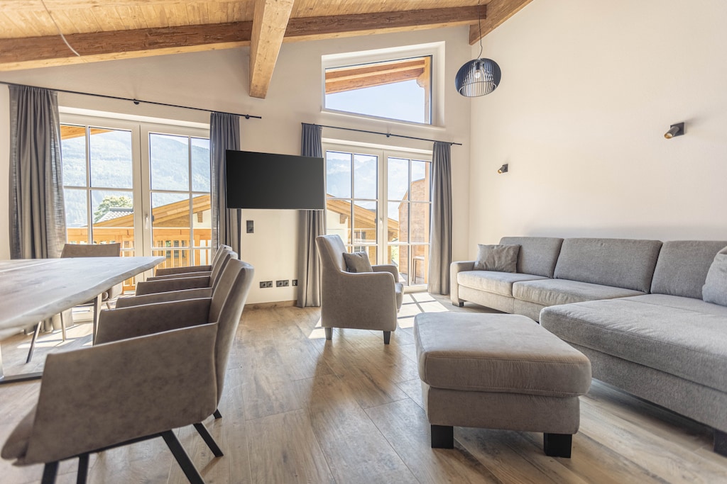 Auf 130 m² bietet das Superior Ferienhaus # 5D mit Sauna Platz für bis zu 10 Personen. Das Ferienhaus erstreckt sich über 2 Etagen und verfügt über 3 Schlafzimmer mit bequemen Doppelbetten, 1 Schlafzimmer mit 2 Etagenbetten, 3 Badezimmer mit Dusche und WC, eine möblierte Terrasse und Balkon mit Bergblick. Für den gemütlichen Tagesausklang sorgt die hauseigene finnische Sauna. Der Wohnbereich sowie die offene Küche befinden sich im Obergeschoss. Diese ist voll ausgestattet: Besteck und (Koch-) Geschirr sind vorhanden, ein Cerankochfeld, Backofen, ein Geschirrspüler und ein Kühlschrank mit Gefrierfach gehören ebenso zur Ausstattung wie Toaster, Wasserkocher und eine Kaffeemaschine. Ein kleines ALPS RESORTS Starterset mit Geschirrspültabs, Geschirrspülmittel (Probe), Schwämmchen, Müllbeutel, Putz- und Geschirrtuch steht bei Ihrer Anreise bereit. WLAN ist kostenlos, Satelliten-TV. Ihr Ferienhaus ist mit einer eigenen E-Ladestation ausgestattet! Hundefreundlich: Auf Anfrage ist auch Ihr Vierbeiner herzlich willkommen (online buchbar). Die Tauern Lodges Uttendorf by ALPS RESORTS: • Ferienhäuser und Ferienwohnung in Uttendorf, Ferienregion Nationalpark Hohe Tauern, Salzburger Land • Mit privater Sauna • Wenige Meter vom Erlebnisbadesee Uttendorf bzw. der Seeloipe • Gästekarte inklusive