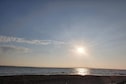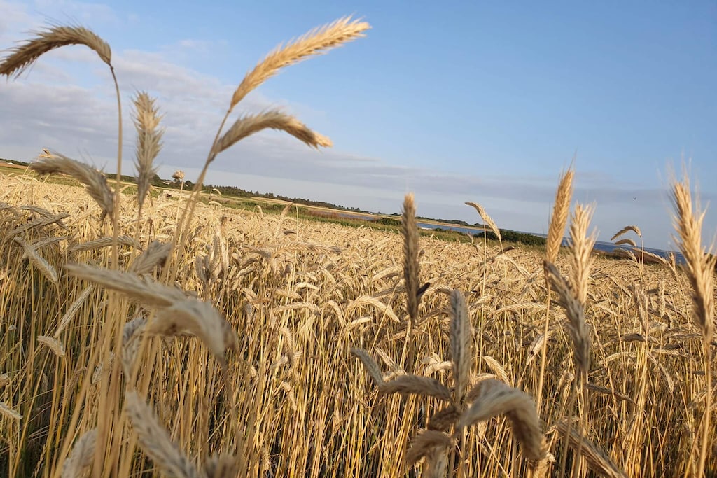 Velkomsten med blomster og Vin og alt fungerede / Udsigten fra huset over limfjorden med solnedgang