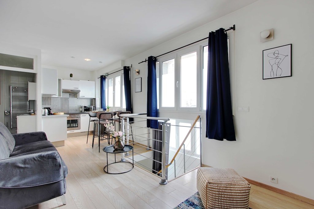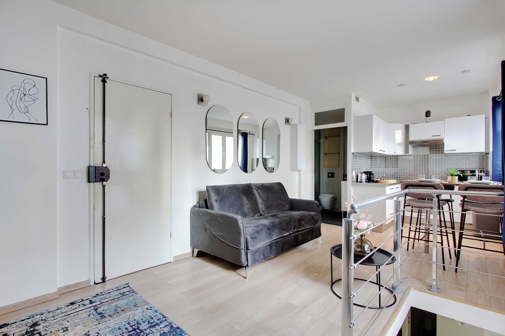 L'appartement est très bien situé, à proximité du métro, préparé avec soin,br/La chambre se trouve à l'étage inférieur, il y a un escalier un peu raide qui peut poser problème à certaines personnes, Une fois le canapé ouvert en position de couchage, il n'y a plus de place pour passer, Néanmoins, c'est un lit très confortable,