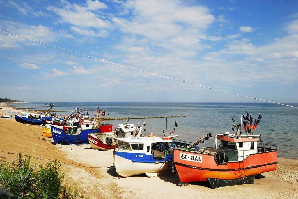 Der Strand von Jarosławiec ist ideal für Touristen, die ein Sonnenbad in einer ruhigen Umgebung genießen möchten. Bunte Fischerboote und goldener Bernstein sind am Strand zu sehen. Nach seiner kürzlichen Renovierung ist der Strand sehr breit und wunderschön.