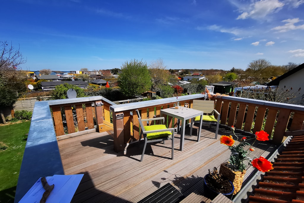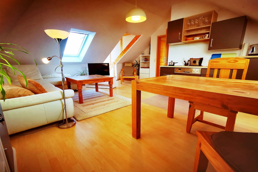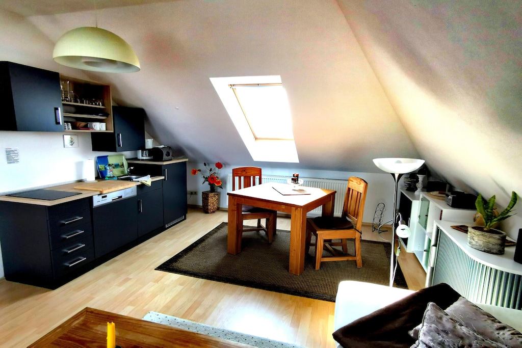 Sie erreichen die Wohnung über eine eigene Treppe und einem eigenen Eingang. Gäste, die mit dem Auto anreisen, können dieses direkt am Haus auf dem kostenfreien Parkplatz abstellen. Zwei große Dachfenster im Wohnbereich sorgen für ausreichend Licht und eine frische Brise in den Sommermonaten.
