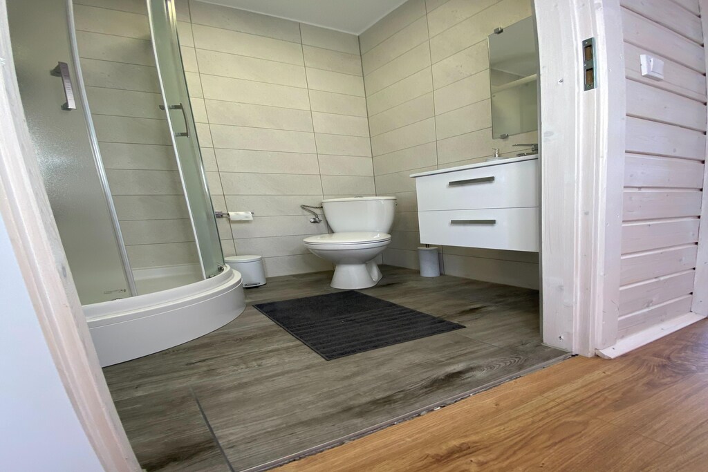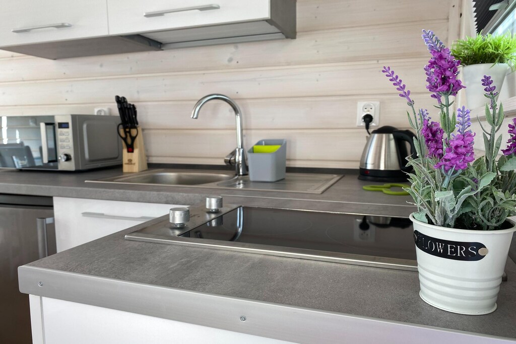 Ein einstöckiges, komfortables Ferienhaus besteht aus einem Wohnzimmer mit Küchenzeile, 2 separaten Schlafzimmern und einem Badezimmer mit Dusche. Das Wohnzimmer verfügt über ein 2-Sitzer-Sofa, einen Fernseher und einen Tisch mit Stühlen. In einem Schlafzimmer gibt es ein Doppelbett, im zweiten Schlafzimmer gibt es ein Etagenbett (3-Personen-Bett - 2-Personen-Bett unten, 1 Person oben). Das Ferienhaus ist mit einer Klimaanlage mit Heiz- und Kühlfunktion ausgestattet. WLAN ist verfügbar. Parkplatz direkt vor der Hütte.
