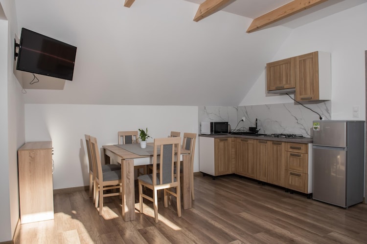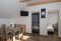 Komfortable 2-Zimmer-Ferienwohnung im ersten Stock. Es bietet bequem Platz für 6 Personen. Es besteht aus einem Wohnzimmer (ausziehbares Doppelsofa, Tisch mit Stühlen und TV), 2 separaten Schlafzimmern und einem Badezimmer mit Dusche. Das Wohnzimmer ist mit der Küche verbunden. Die Wohnung verfügt über eine Entspannungsterrasse mit Gartenmöbeln und Grill. Den Gästen steht WLAN zur Verfügung.