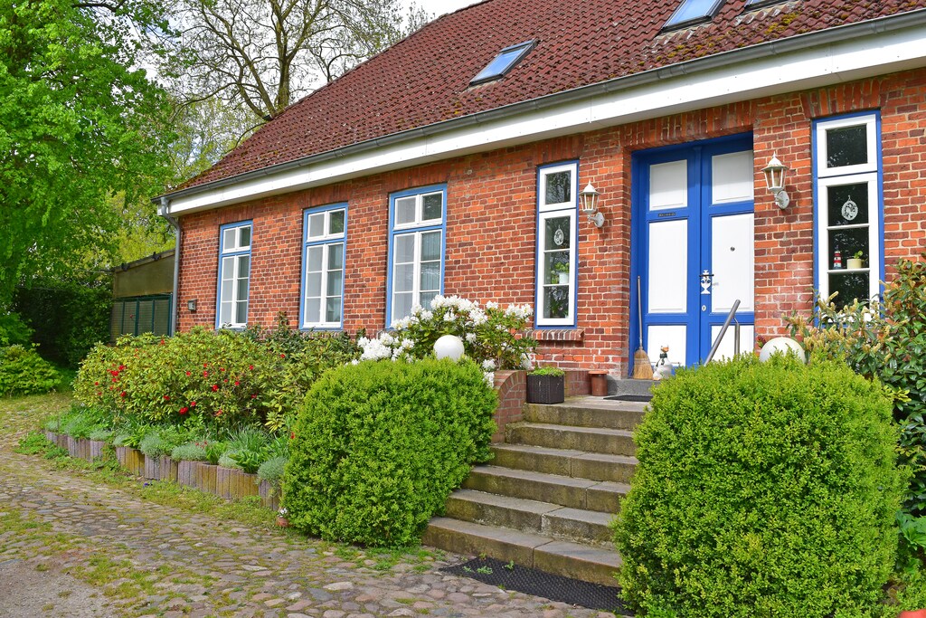 Et herlig tilflukt! Ferienwohnung im Gutshaus Schulenbrook ligger i et fredelig område med vakre hager, Vi likte å nyte morgenkaffen ute, Leiligheten var ren og godt utstyrt, virkelig et hjem borte fra hjemmet