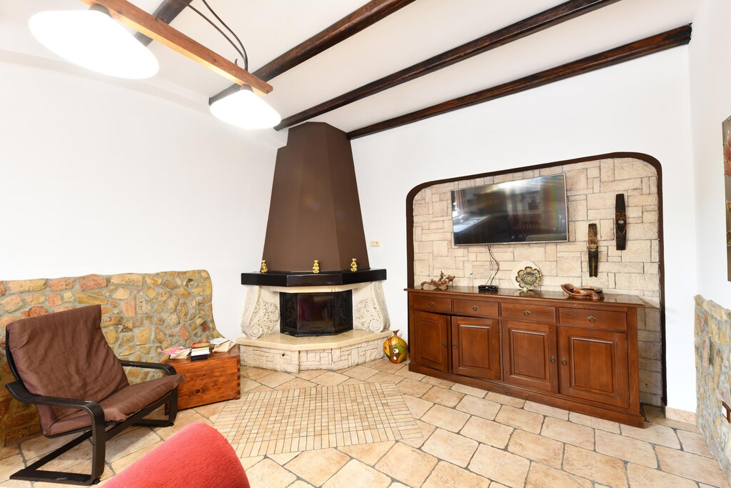 Angrenzend zur Küche liegt der Wohnraum mit Polstermöbel, einen offenen Holzkamin, SAT-TV mit Flachbildschirm und Klimaanlage.