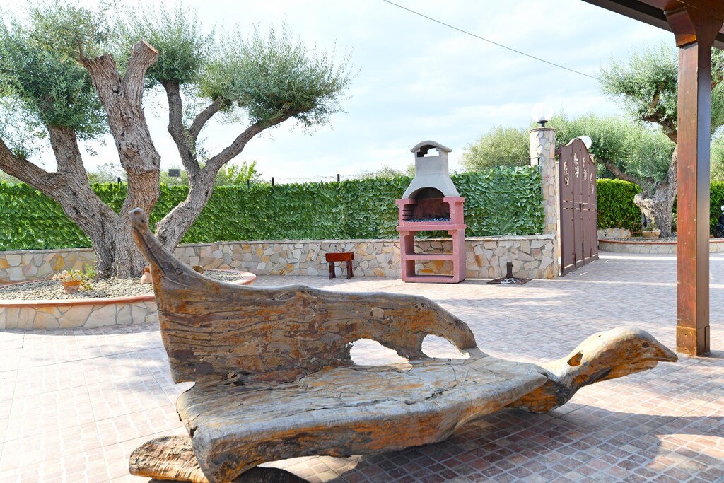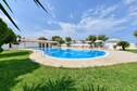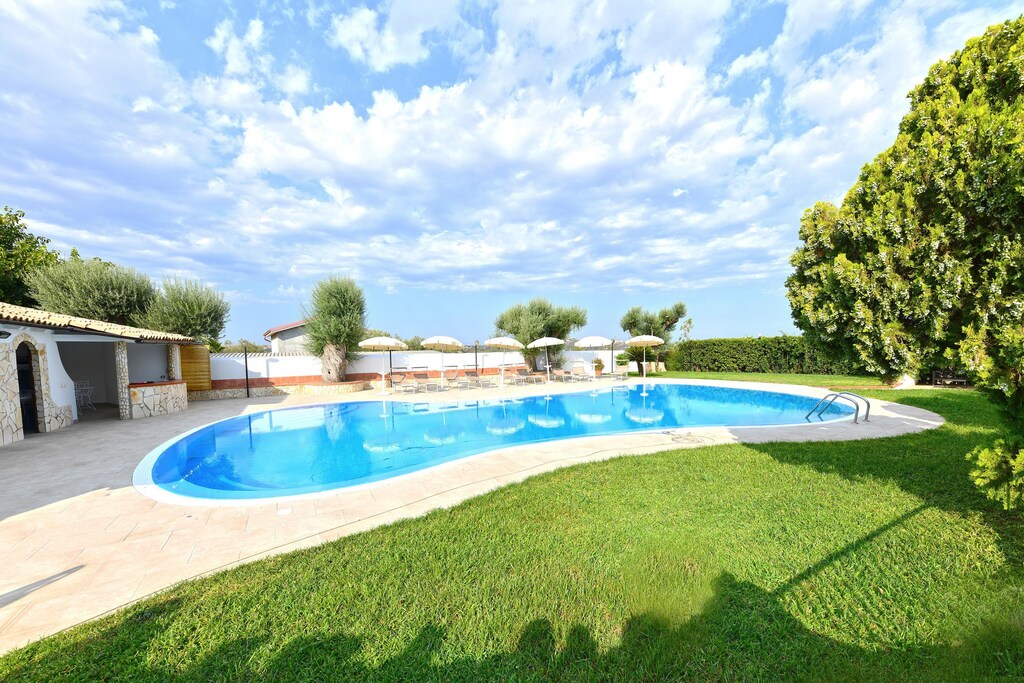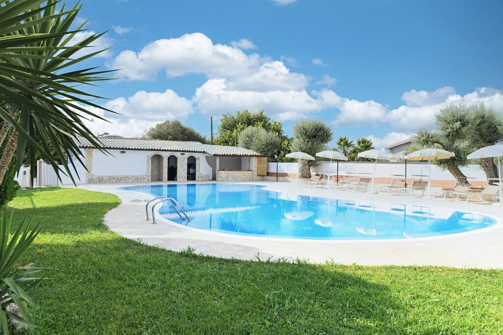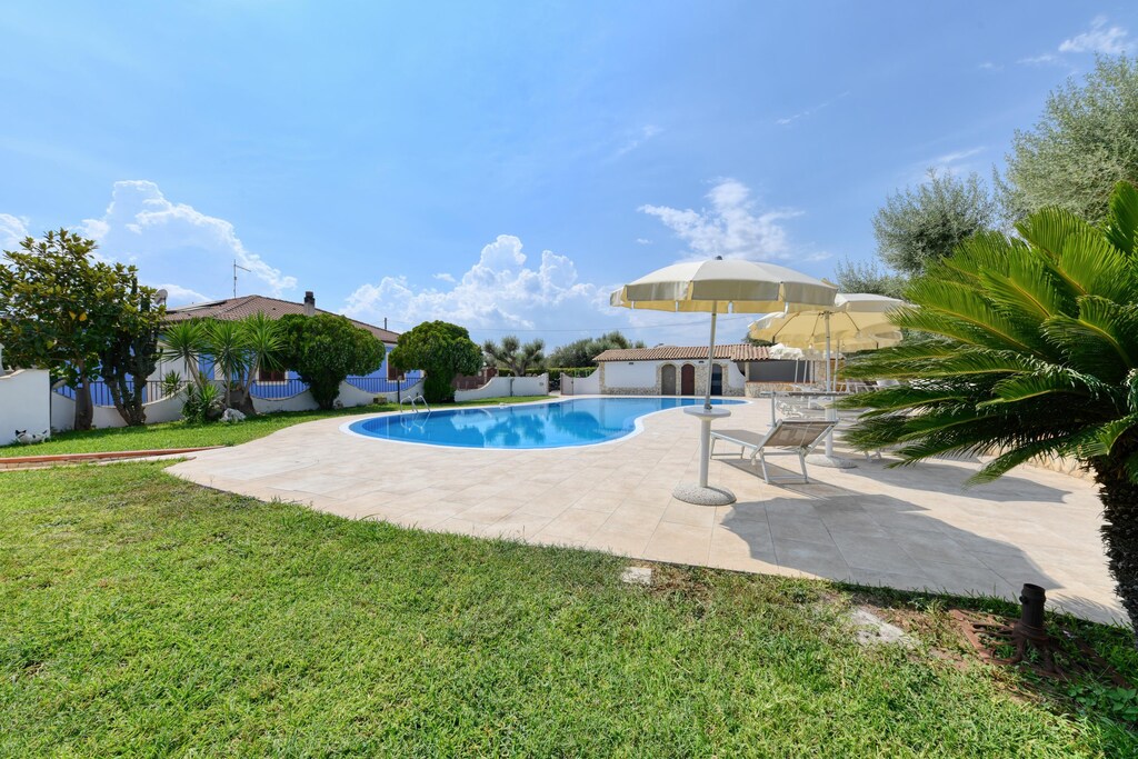 Die vielfältige und sehr gepflegte Außenanlage ist liebevoll und extrem großzügig ausgelegt. Der hier befindliche Höhepunkt, zentral gelegen und umgeben von einer Rasenfläche, Olivenbäumen und Palmen besteht in der Form eines herrlichen Privatpools mit Liegestuehlen und Sonnenschirmen.