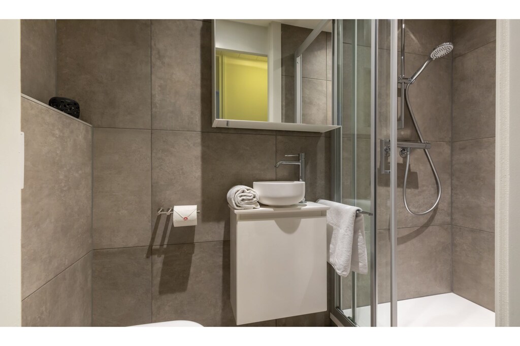 Badezimmer: Ein moderner Raum mit Dusche, Waschbecken und Toilette.